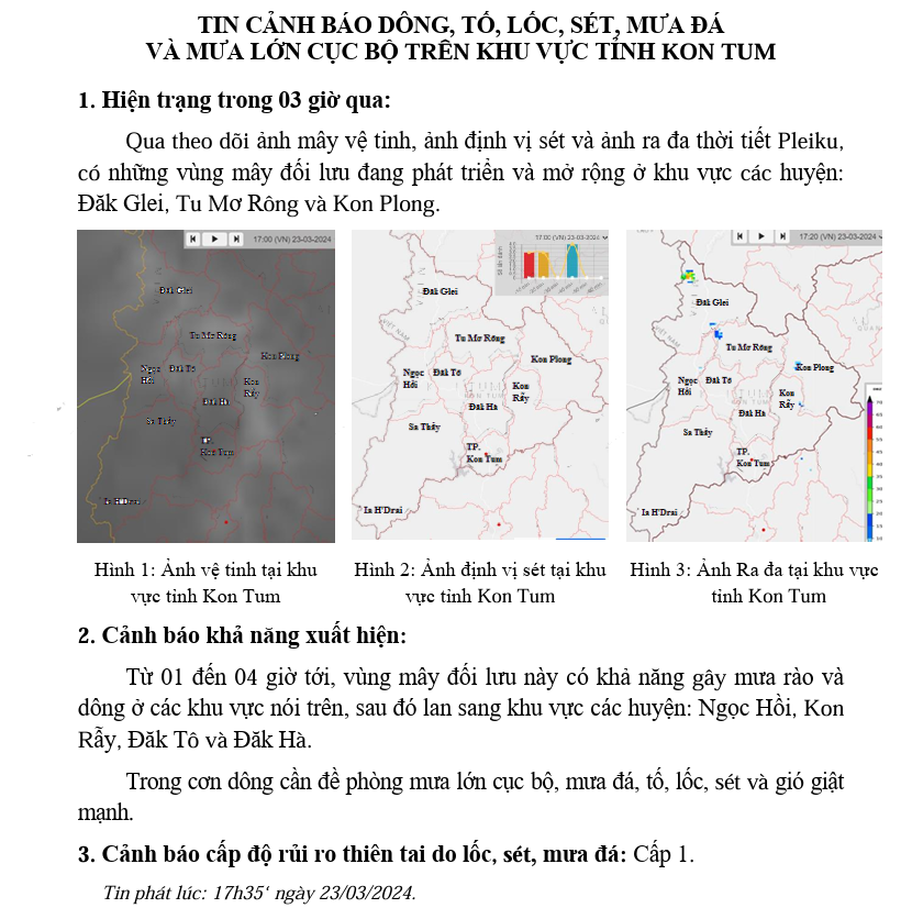 TIN CẢNH BÁO DÔNG, TỐ, LỐC, SÉT, MƯA ĐÁ VÀ MƯA LỚN CỤC BỘ TRÊN KHU VỰC TỈNH KON TUM