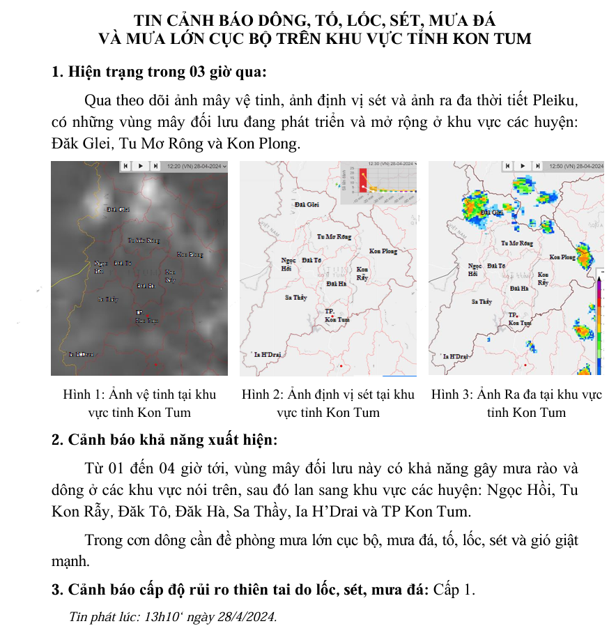 TIN CẢNH BÁO DÔNG, TỐ, LỐC, SÉT, MƯA ĐÁ VÀ MƯA LỚN CỤC BỘ TRÊN KHU VỰC TỈNH KON TUM