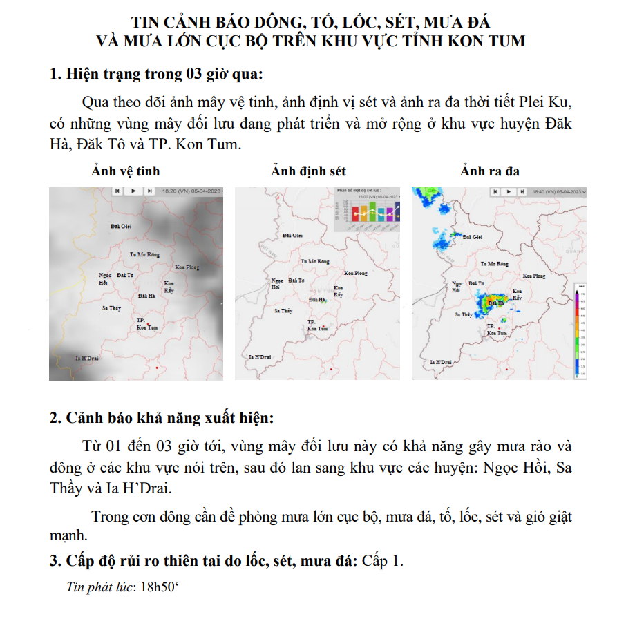 TIN CẢNH BÁO DÔNG, TỐ, LỐC, SÉT, MƯA ĐÁ VÀ MƯA LỚN CỤC BỘ TRÊN KHU VỰC TỈNH KON TUM