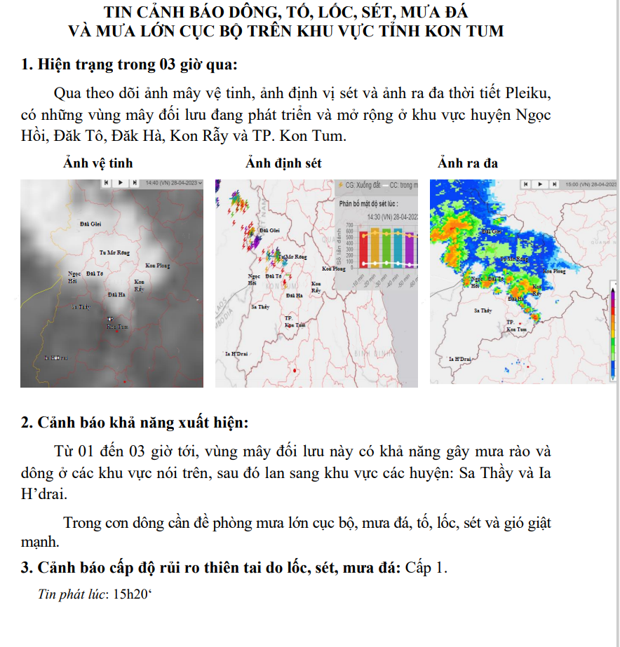 TIN CẢNH BÁO DÔNG, TỐ, LỐC, SÉT, MƯA ĐÁ VÀ MƯA LỚN CỤC BỘ TRÊN KHU VỰC TỈNH KON TUM