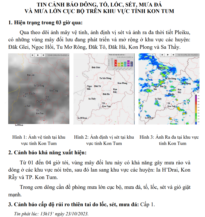TIN CẢNH BÁO DÔNG, TỐ, LỐC, SÉT, MƯA ĐÁ VÀ MƯA LỚN CỤC BỘ TRÊN KHU VỰC TỈNH KON TUM